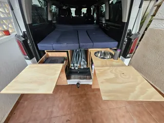 Se vende mueble camper hecho a mano, son 2 muebles que se unen y quedan en una pieza para que sea fácil sacarlos, se puede hacer la cama con la segunda fila de asientos, tiene fregadero, 40 litros de agua limpia y 36 litros de sucia, gran cajón de almacenaje y sitio para el campingaz, (no se venden los accesorios del interior de los cajones, campingaz oscurecedores, etc...) Actualmente está montado en una Mercedes Viano, pero por dimensiones imagino que valdrá para una t5 o t6 ya que son similares.