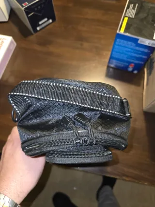 Bolsa negra para moto con diseño texturizado y detalles en blanco. - Compartimento principal con cremallera. - Bolsillo frontal con cremallera. - Asa superior para transporte. - Correa ajustable. - Logo de RAINERS en la parte frontal. - Se coloca en el depósito de gasolina con los humanes que tiene.