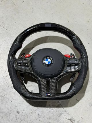 Volante deportivo BMW M en acabado de carbono, con pantalla integrada y airbag. - Diseño deportivo en fibra de carbono. - Con levas M de carbono y botonera completa. - Incorpora pantalla digital y leds de cambio. - Cuero perforado terminado con hilo rojo. - Incluye airbag nuevo. Nuevo a estrenar.