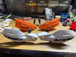 Protecciones de manillar para moto, marca Acerbis en color blanco y MEC en color naranja. Tienen alguna rozadura pero no están ni rotos ni doblados. Se venden por no utilizarse. Originales. - Paramanos Acerbis blancos. - Paramanos MEC naranjas.
