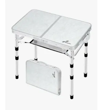 Mesa plegable de aluminio, ideal para actividades al aire libre como camping o picnics. Su diseño compacto la hace fácil de transportar y almacenar. - Superficie de mesa con diseño marmoleado. - Patas ajustables en altura. - Incluye una red de almacenamiento debajo de la mesa. - Se pliega en un maletín compacto para su transporte.