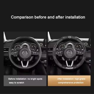 Funda para volante de coche Mazda en color café. - Diseño con detalles en fibra de carbono. - Logotipo de Mazda en relieve.