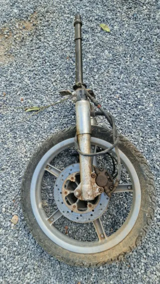 Tren delantero completo de Piaggio Liberty 125 antigua. Incluye horquilla, rueda, disco y pinza de freno. Ideal para recambio. Se vende tal cual está, procedente de moto desmontada. - Llanta de aleación. - Disco de freno. - Horquilla delantera.