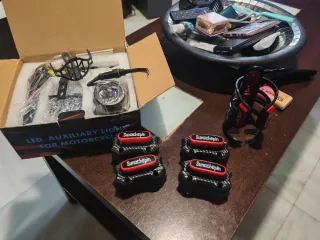 Kit de luces LED auxiliares para moto Botellero de bebidas Protector de antibuelcos. - Incluye dos unidades de luces. - Diseño con detalles en rojo y negro. No acepto ofertas el precio el que hay todo es nuevo.