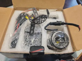 Faros circulares con aro de luz LED, nuevos y sin usar. - Diseño moderno con múltiples proyectores. - Aro de luz blanca para posición o DRL. - Compatibles con Land Rover Defender y Jeep Wrangler.