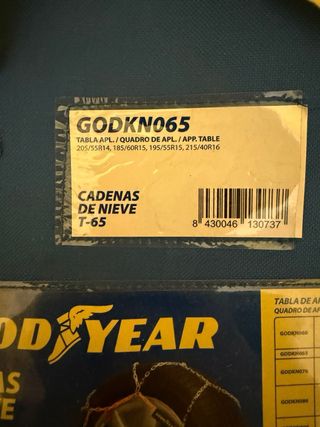 Juego de cadenas para la nieve Goodyear T-65. - Modelo: GODKN065 - Talla: T-65 - Incluye tabla de aplicaciones para diferentes medidas de neumático. - Fácil montaje. - 2 unidades incluidas.