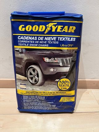 Cadenas de nieve textiles Goodyear Ultra Grip sin estrenar. - Incluye 2 unidades. - Fabricadas con material 100% textil. - Rápido y fácil de instalar. - Silenciosas y no vibran. - No deterioran el neumático. - Uso solo en carretera con nieve o hielo. - Incluye guantes.