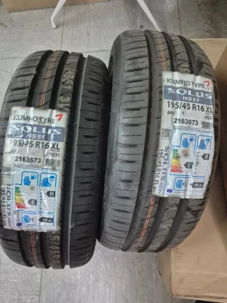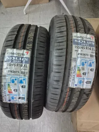 Dos neumáticos Kumho Solus HS51. - Medida: 195/45 R16 XL. - Índice de carga y velocidad: 84V. - Etiqueta energética: E (consumo), B (agarre en mojado), 69 dB (ruido). - Código de producto: 2163673.