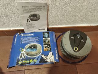 Compresor de aire Michelin de 12v, ideal para inflar neumáticos de coche, moto o bicicleta. Se encuentra en buen estado y listo para usar. - Compresor de 12 voltios. - Incluye manguera y accesorios. - Diseño compacto y portátil. - Fácil de usar.