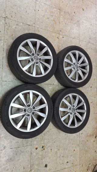 Juego de cuatro llantas de 17 pulgadas, originales del Volkswagen Golf 7 en muy buen estado. Vendo juego de llantas y regalo neumaticos de nieve Michelin Alpine5 2 al 50% y los otros 2 para cambiar por ya gastados... Son 205/50/17 - Compatibles con todo el grupo Vag Golf, passat, Leon, Octabia... Estaban montadas en Volkswagen Golf 7.
