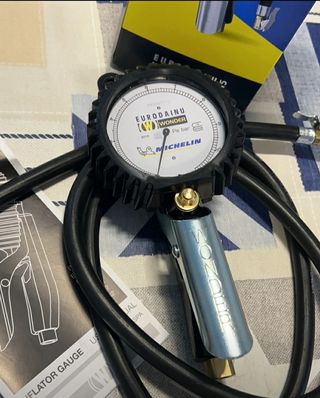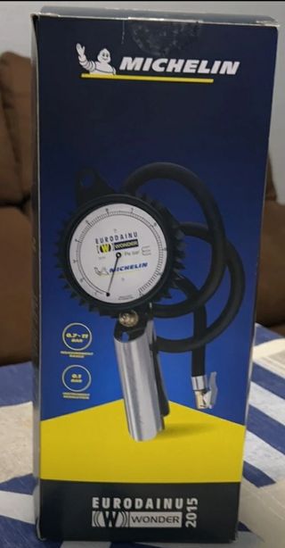 Manómetro certificado michelín para hinchar neumáticos de coches. Manguera con puntero para válvulas convencionales. De alta calidad y precisión.