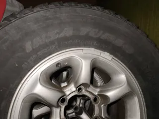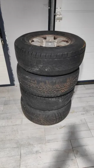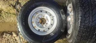 5 Llantas en 15 pulgadas 6x139.7 6Jx15 ET33 procedentes de Mitsubishi Pajero v20 2.8. Medida neumáticos 265/70/15 112T. La quinta llanta la tengo que quitar del coche todavía. Llantas en buen estado, neumáticos del 16 pero usables y pasan ITV (pasé la ITV con ellas en septiembre). Se entregan con las 4 tapas centrales de Mitsubishi, los hierros para sujetar las tapas centrales y las 24 tuercas para las llantas. No marear