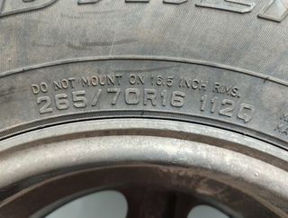 4 neumáticos y llantas, estaban montadas en un Mitsubishi montero, 3 neumáticos están en buen estado y uno tiene un pequeño bulto en el lateral, se venden juntas, medida equivalente a unas 31x12,5r16 - Medida: LT265/75R16. - Índice de carga: 119/116Q. - Tipo: Radial M+S Tubeless.