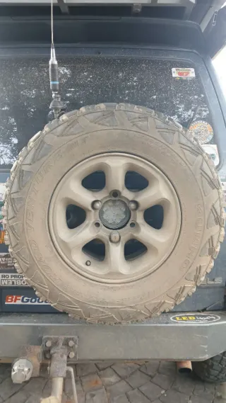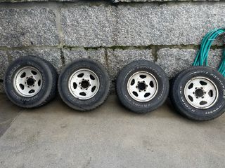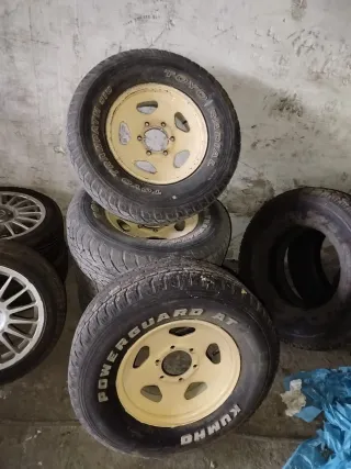 Juego de 4 llantas con cubierta para Mitsubishi Montero. - Llantas todoterreno con gomas , dos de ellas son nuevas , con 300 km marca APLUS de 2025, las otras dos son bf goodrich pero tienen sus años y estan duras .equivalen a neumaticos de 32 pulgadas - Medida: LT235/85R16. Se pueden enviar en dos paquetes . No se venden sueltas