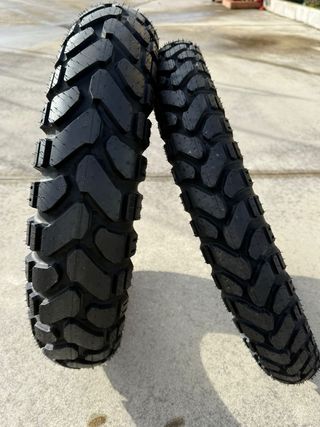 Dos neumáticos como nuevos para moto de trail marca Helios, procedente de Voge 300 rally 2025 Medidas delantera 80/100-R21 Medidas trasera 120/80-R18 Diseñados para ofrecer buen agarre en diferentes terrenos. Apenas usados. - Dibujo agresivo para tracción. - Construcción robusta. Dan muy buenas sensaciones en asfalto, con pocas vibraciones, y en tierra funcionan fenomenal.