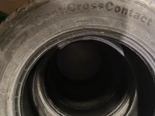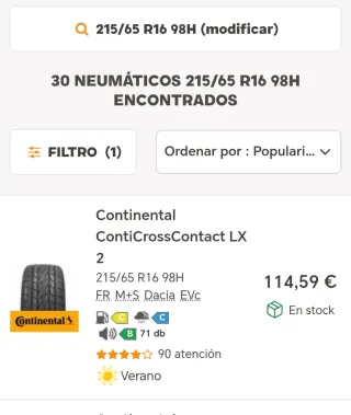 Neumáticos Continental ContiCrossContact LX 2. - Medida: 215/65 R16 98H. - Tipo: FR M+S Dacia EVc. - Eficiencia energética: C. - Agarre en mojado: C. - Ruido exterior: B (71 db). - Temporada: Verano. Hay dos neumáticos en muy muy buen estado 20% de desgaste como mucho y 2 neumáticos un pocoas gastados, pero 2 están muy muy bien, año 2019 como se aprecia en la imagen... 2 neumáticos al 80% de vida 80 eur los 2 ( total pareja) 2 neumáticos más gastados 40eur los 2 ( total pareja) Los 4 neumáticos 100eur
