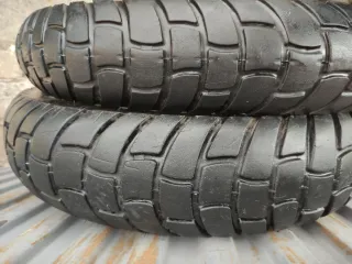 Neumático de moto en buen estado. - Diseño con tacos para un buen agarre. - Color negro. Delantero 2,50-21 continental Trasero 3,00-18 tkm Precio por los dos