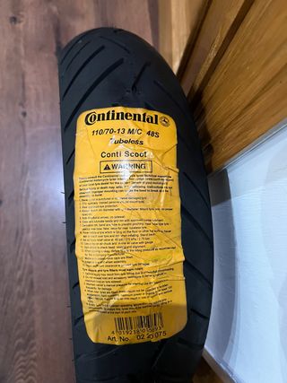 Neumático nuevo a estrenar de la marca Continental, modelo Conti Scoot. - Medida: 110/70-13 M/C 48S. - Tipo: Tubeless (sin cámara). - Diseñado para scooters.