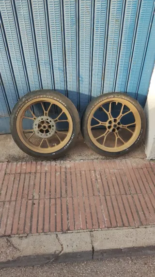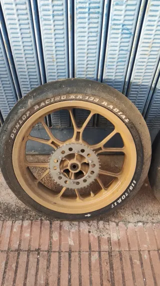 Juego de dos ruedas para Yamaha YZF-125-R. - Llantas pintadas doradas. - Color original azul - Incluye piñón. - Llantas de aleación de 10 palos (estilo deportivo) - Con anclaje para disco de 6 tornillos Neumáticos Dunlop Racing kr 133 radial slick: Delantera: Dunlop Racing 120/70 ZR17 Trasera: Dunlop Racing 160/60 ZR17 Los neumáticos tienen poco uso pero son viejos Referencia J17xMT3.50 DOT ZCV GRAZZEY J17xMT275 DOT ZCV GRAZZEY Válidas oaramuchos modelos como la YBR 125-250 Ideal para algun proyecto de restauración o custom
