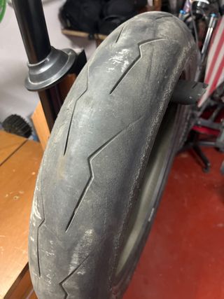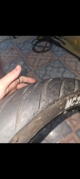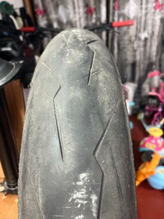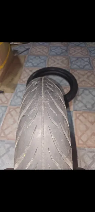 Neumático de moto brigestone s21 en buen estado. - Dibujo profundo y bien conservado. - Ideal para uso en carretera debido a su diseño tricompuesto (centro más duro, exteriores blandos) - Año 2020 pero en buen estado de conservación y agarre - Medidas 150/60 zr17, montado en una KTM supermotard, equivalente con la 160/60 zr17 - Se cambia por cambio a compuesto más deportivo (en los karting mientras tocas rodilla no puedes acelerar porque derrapa jeje)