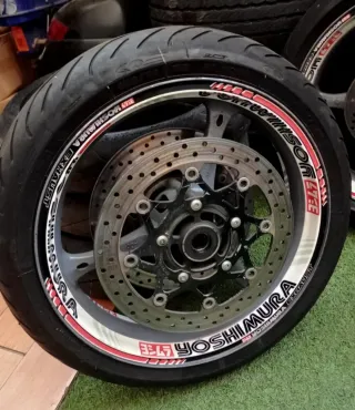 Llanta delantera para Suzuki GSXR K7 con detalles Yoshimura. - Diseño deportivo. - Llanta de aleación. - Incluye disco de freno.