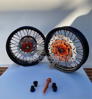 Se vende Kit Completo de llantas para supermotard en color negro con bujes naranjas. Todo lo necesario para instalar neumáticos y montarlas en su moto. NUEVO - Llantas de alta calidad 17 pulgadas - Delantera 3,5 / Trasera 5,0 - Diseño deportivo. - Incluye: Discos de freno + Corona + Adaptador de Pinza + Espaciadores. ENVÍO INMEDIATO 24/48h SX, TPI, EXC, Ktm, Yamaha, Gas gas, Husqvarna, Kawasaki, Suzuki, Excel, Twenty, Power Parts.