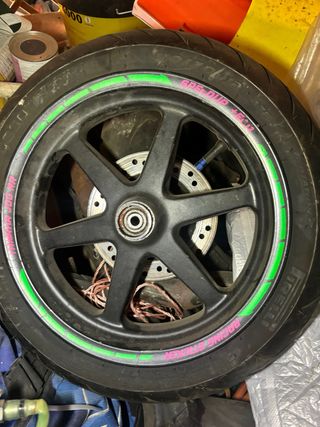 Juego de llantas para Yamaha Jog, delantera y trasera. - Llantas con diseño deportivo. - Incluye detalles en color verde y rosa. - Marca Pirelli. Unidad