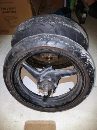 Llantas y neumáticos para Honda CBR600F4i. - Neumáticos Dunlop. A media vida. - Sin el freno de disco. Cubiertas. Ese precio todo junto. Ruedas. Por separado 150 euros delantera y 160 trasera.