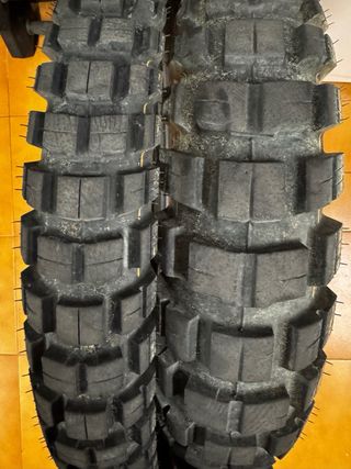 Neumáticos para motocicleta Rallyen perfecto estado, nuevos. Originales de una Rieju 307 rally Adventure. - Diseño de tacos para mayor agarre. - Material de goma resistente.