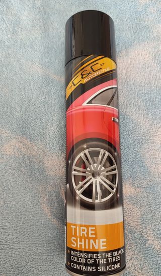 Abrillantador de neumáticos en spray. Devuelve el color a tus neumáticos, contiene siliconas que protegen contra las inclemencias del tiempo. Nuevo.