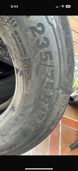 Neumáticos de la medida 235/75R17.5. S - Indicador M+S (Mud and Snow). - Apto para retread (retreading). - Diseño de banda de rodadura optimizado para tracción. Se vende por no servirme y ni se ha montado,Se vende la pareja