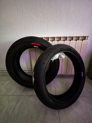 Neumáticos moto 3 slicks de seco Marca: Pirelli Compuesto: blando delante, medio atrás.... Hay diferentes compuesto preguntar Medidas Trasero: 120/70R17 Delante 90/70R17 Todos los neumático tienen entre 7/15 vueltas Precio de una pareja no negociable el que sabe sabe que la pareja nueva vale +450€ Se envían el mismo día si se tiene los compuestos que se busca Depende cuantas parejas se baja el precio