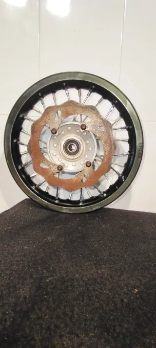 Rueda delantera para pit bike con llanta de 10 pulgadas. Incluye disco de freno. Es nueva sin estrenar el disco está oxidado del almacenamiento. - RUEDA DELANTERA 10" PATA MOTOS DE CROSS INFANTIL - Llanta de 10 pulgadas. - Disco de freno incluido.