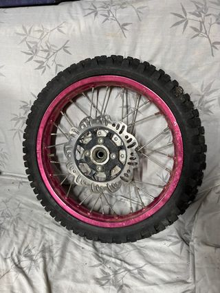 Rueda delantera para pit bike con llanta de color rosa. - Llanta de aluminio. - Radios de acero. - Disco de freno incluido.