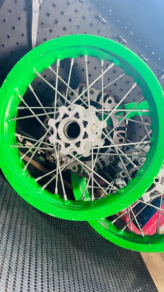 Juego de ruedas para pit bike. - Incluye llanta, neumático y radios. - Neumático de tacos para off-road. Alas llantas les faltan un par de radios
