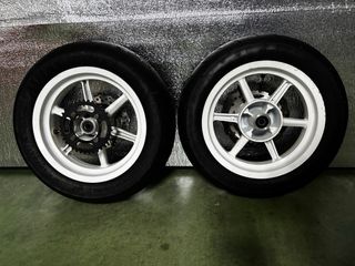 Juego de llantas y neumáticos para pitbike. Listos para instalar. - Llantas pitbike de 12”. - Neumaticos sin estrenar. - Regalo discos de freno y plato de 37 dientes. - Con válvulas a 90 grados.