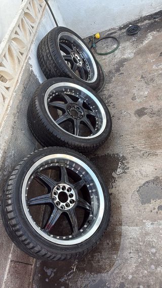 Juego de llantas Lenso S7 Modify en 18 pulgadas con garganta. Mismo modelo que las Axis Seven de Fast & Furious. Muy difíciles de encontrar en España. Ideales para réplica de Mitsubishi Eclipse de A Todo Gas. No tienen las tapas centrales. 2 de ellas tienen un golpe y habría que restaurarlas. De ahí su precio. Neumáticos incluídos. axis se7en tuning drift llanta deportiva replica