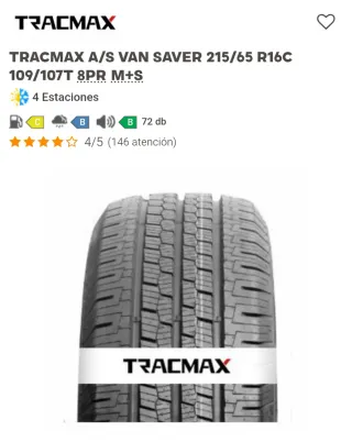 4 Neumáticos TRACMAX A/S VAN SAVER en medida 215/65 R16C. Dot 2725 - Índice de carga 109/107T. - Marcado M+S. Símbolo nieve - Apto para 4 estaciones. - Etiqueta energética: C (consumo), B (mojado). - Ruido: 72 dB.