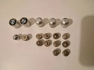 Conjunto de tapones para neumáticos y válvulas. - Dos tapones plateados con logo BMW. - Tres tapones plateados con rosca. - Un tapón plateado liso. - Siete tapones pequeños de válvula.