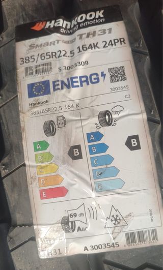 Neumático Hankook modelo TH31, tamaño 385/65 R22.5. - Medida: 385/65R22.5 - Índice de carga: 164K - Diámetro de llanta: 22.5 - Modelo: TH31 - Clase de eficiencia de combustible: C - Clase de agarre en mojado: B - Nivel de ruido exterior: 69 dB