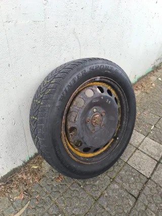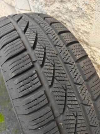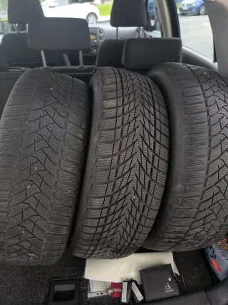Conjunto de 4 neumáticos de invierno. 2 Dunlop Winter Sport 5 en muy buen estado y dos de otra marca que no recuerdo, son optimos para la nieve, usados en alemania solo para los meses de invierno, neumatico con llanta. Medidas : 205/55/16 - Diseñados para ofrecer un buen agarre en condiciones de nieve y hielo. - Tread pattern visible.