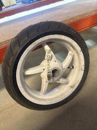 Llanta de Aprilia SR con freno de tambor. El aro es de color blanco. - Llanta de aleación. - Diseño de 5 radios.