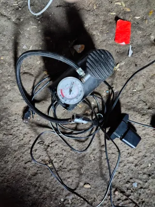 Compresor de aire portátil de 12 V para coche, pequeño y compacto, con manómetro, manguera flexible y cable para encendedor. Se usa para inflar neumáticos y otros objetos inflables.