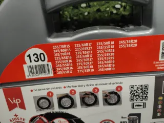 Cadenas textiles para nieve DriveTex, talla 72. Ideales para circular en condiciones de nieve o hielo. No produce vibraciones. Se puede comprobar la medida del neumático en la foto adjunta. Abiertas pero sin estrenar (me equivoqué de talla). - Montaje rápido en 3 pasos. - Incluye bolsa de almacenamiento. - Velocidad máxima recomendada: 50 km/h. - Fabricadas en poliéster.