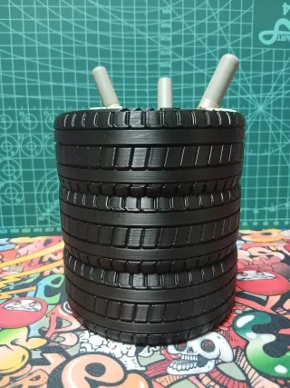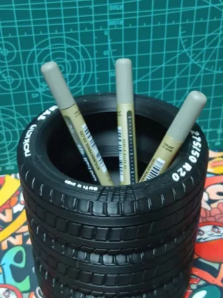 Porta lápices con diseño de ruedas Nokian. Ideal para organizar tu escritorio con un toque original. - Fabricado con impresión 3D. - Diseño inspirado en neumáticos Nokian.