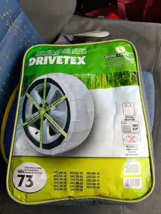 Fundas de nieve textiles DRIVETEX, talla 73. Incluyen guantes. - Medida de neumático: 235/60-14, 215/65-14, 205/70-14, 175/80-14, 235/55-15, 215/60-15, 195/65-15, 185/70-15, 175/75-15, 165/80-15, 235/50-16, 215/55-16, 195/60-16, 235/45-17, 205/50-17, 225/40-18, 205/45-18. - Homologadas para ABS y ESP. - No producen vibraciones durante la conducción.