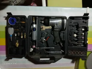 Este es un kit de herramientas neumáticas que incluye una pistola de impacto y accesorios. - Pistola de impacto - Mini esmeriladora -Carraca neumática -Pistla de soplado - Accesorios varios para esmerilado - Adaptadores y conexiones - Cinta de teflón - Botella de aceite