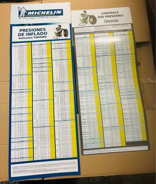 Cartel informativo de Michelin sobre presiones de inflado para vehículos turismo y comerciales. Tabla de presiones. - Incluye tabla de presiones para vehículos turismo. - Incluye tabla de presiones para vehículos comerciales. - Diseño con el logo y mascota de Michelin.
