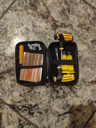 Kit compacto para reparar pinchazos de neumáticos. - Incluye herramienta para insertar el parche. - Varios parches de reparación. - Tubos de pegamento. -Para reparar tus neumáticos en cualquier situacion y cualquier lugar.