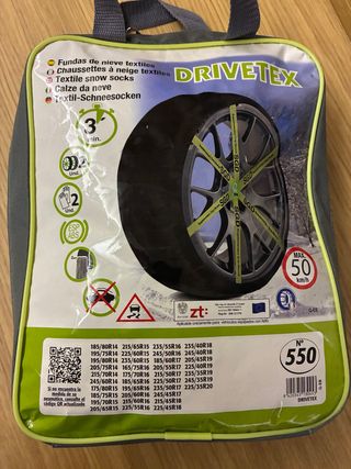 Cadenas de nieve textiles marca DRIVETEX, talla L. - Instalación rápida en 3 minutos. - Incluye par de guantes. - Compatibles con ABS y ESP. - Velocidad máxima recomendada: 50 km/h. - Incluye bolsa de transporte.